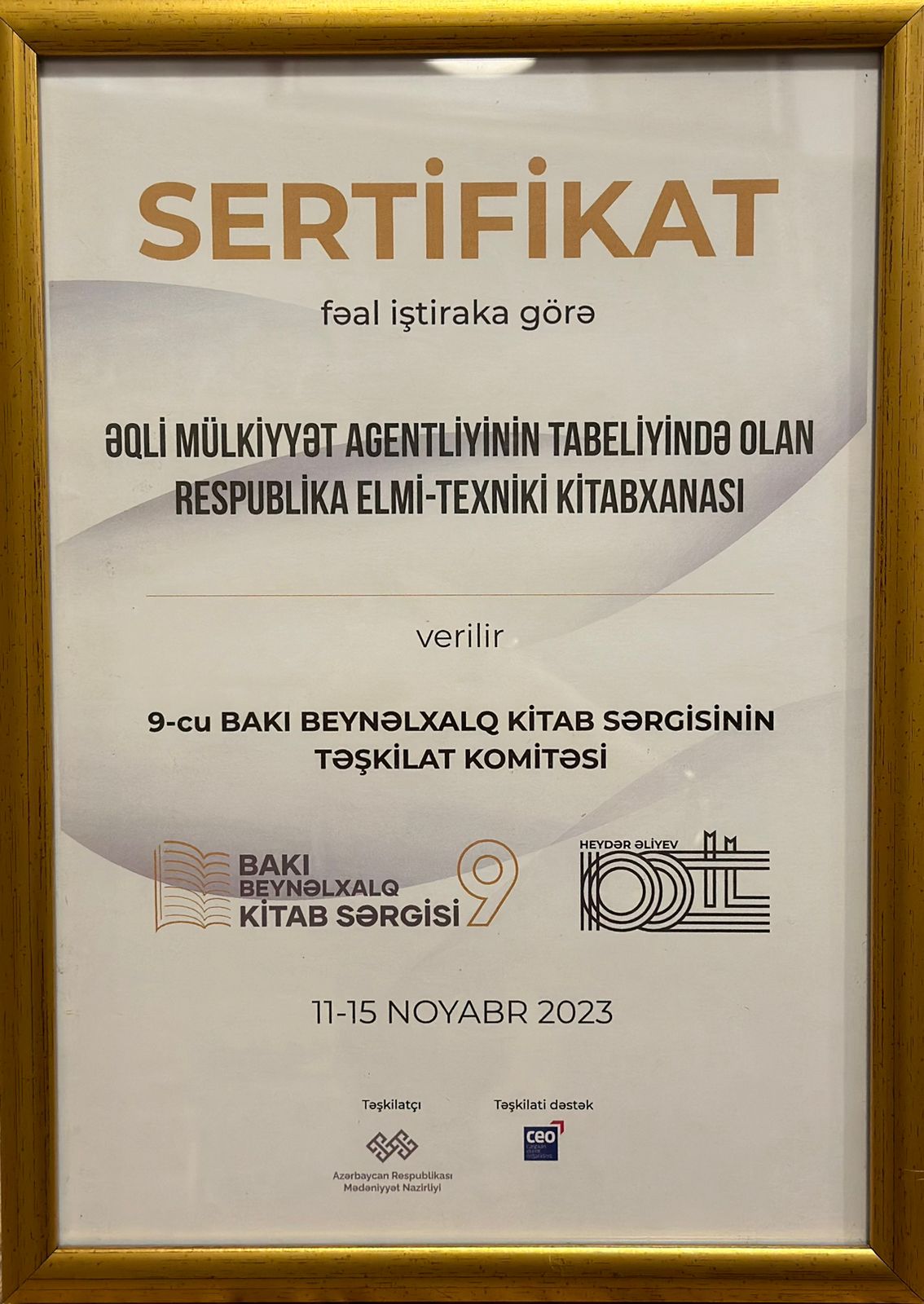 Azərbaycan Respublikası Mədəniyyət Nazirliyinin təşkilatçılığı ilə 2023-cü il noyabrın 11-dən 15-dək Bakı Ekspo Mərkəzində Ümummilli Lider Heydər Əliyevin 100 illik yubileyinə həsr olunan 9-cu Bakı Beynəlxalq Kitab Sərgisi
